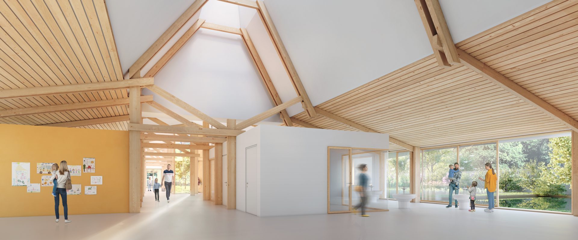 Cette forme en plan permet de créer un point central offrant une articulation autour de laquelle nous organisons le fonctionnement de ce bâtiment. C’est donc ici que se situera le hall, les accueils et l’ensemble des points convergeant des trois grandes fonctions du bâtiment : élémentaire, périscolaire et maternelle.